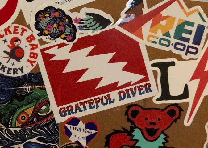 "How perfect that there was an empty spot for my Grateful Diver lightning bolt sticker right above my Grateful Dead dancing bear. That's kismet."