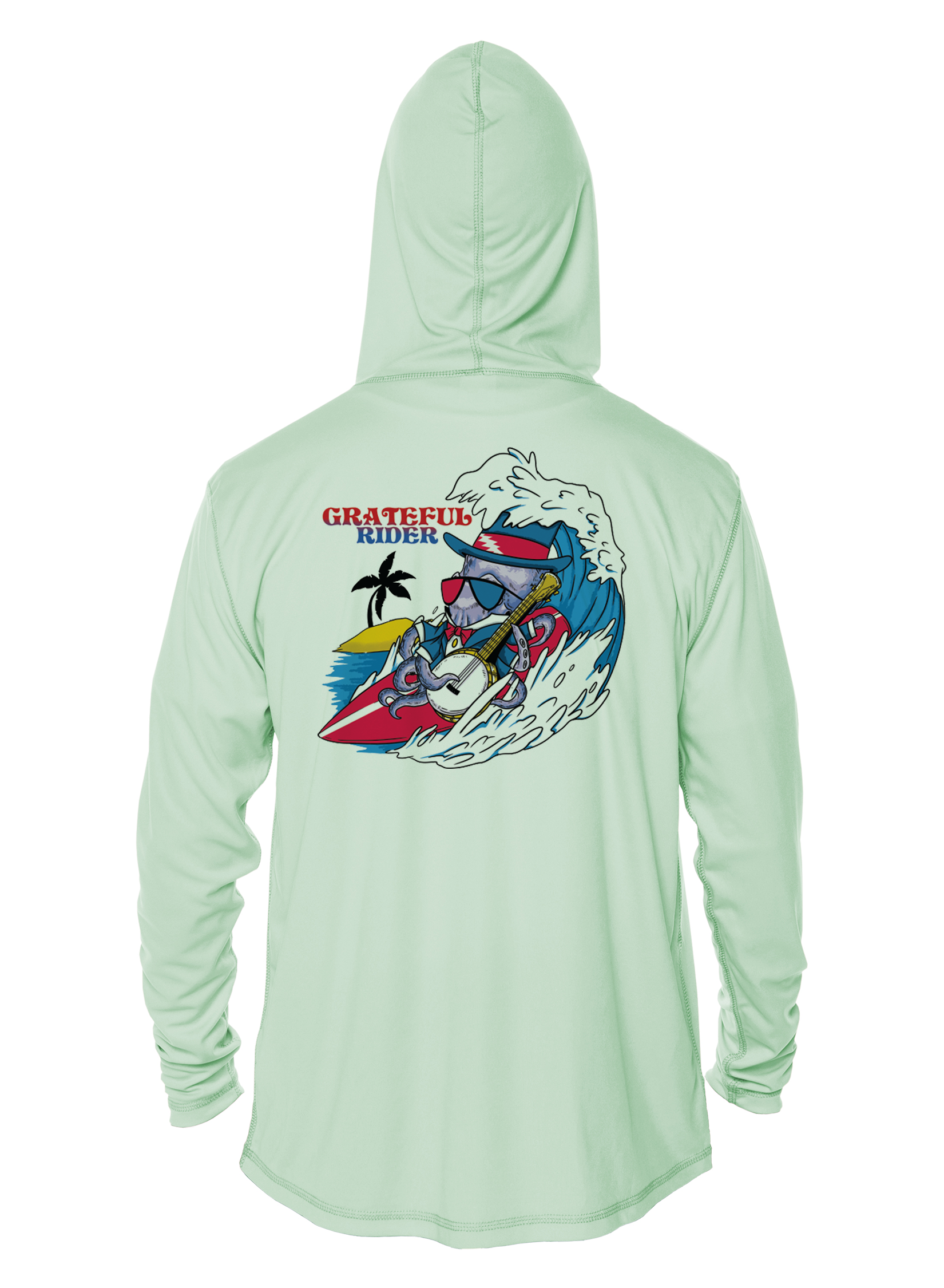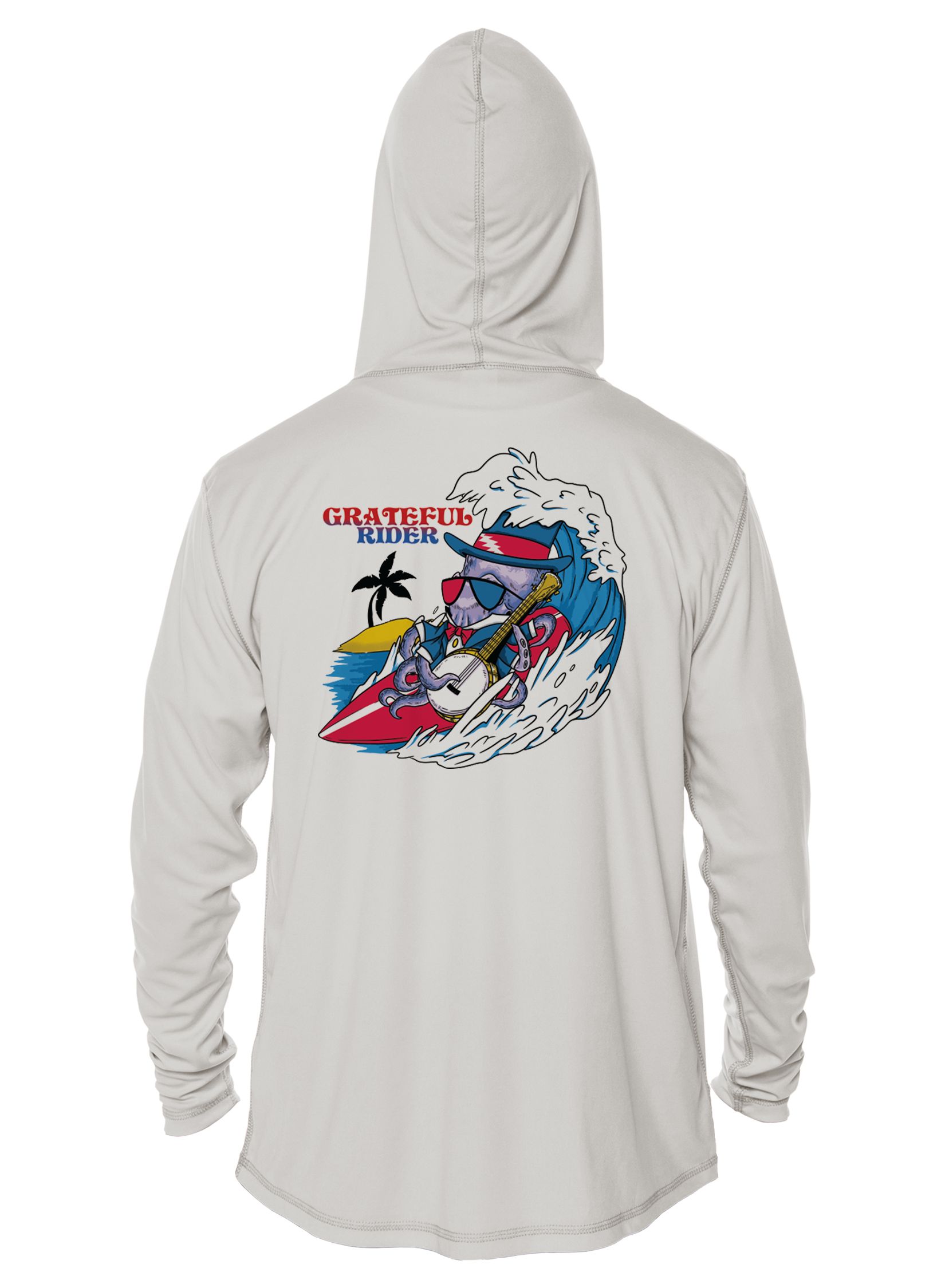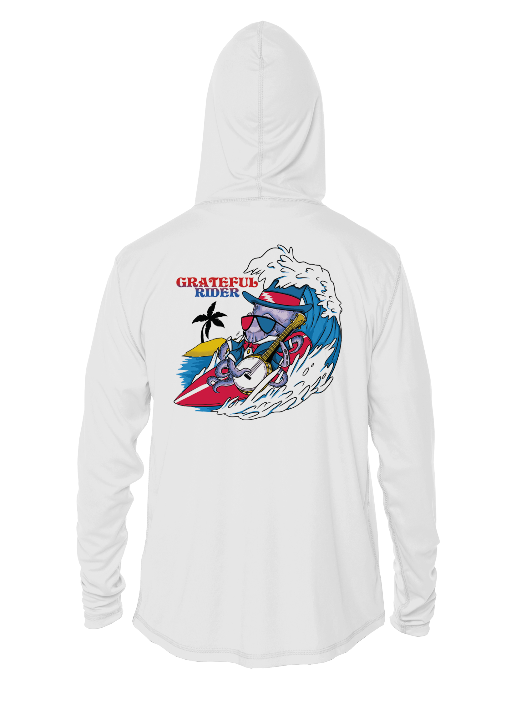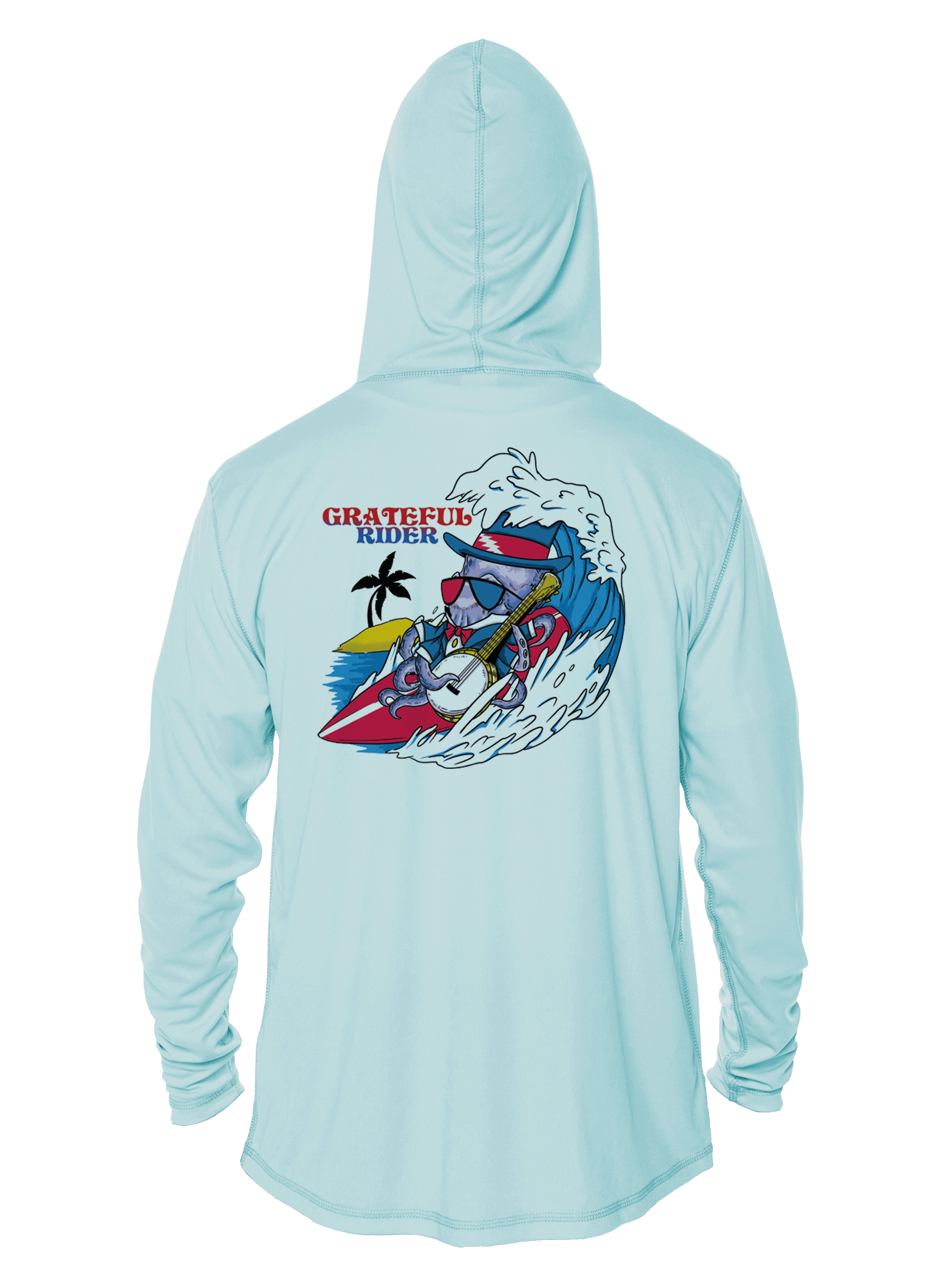You can find Octopus Sam on the crest of a wave in the all new Surfing Sam UPF 50+ Performance Hoodie!