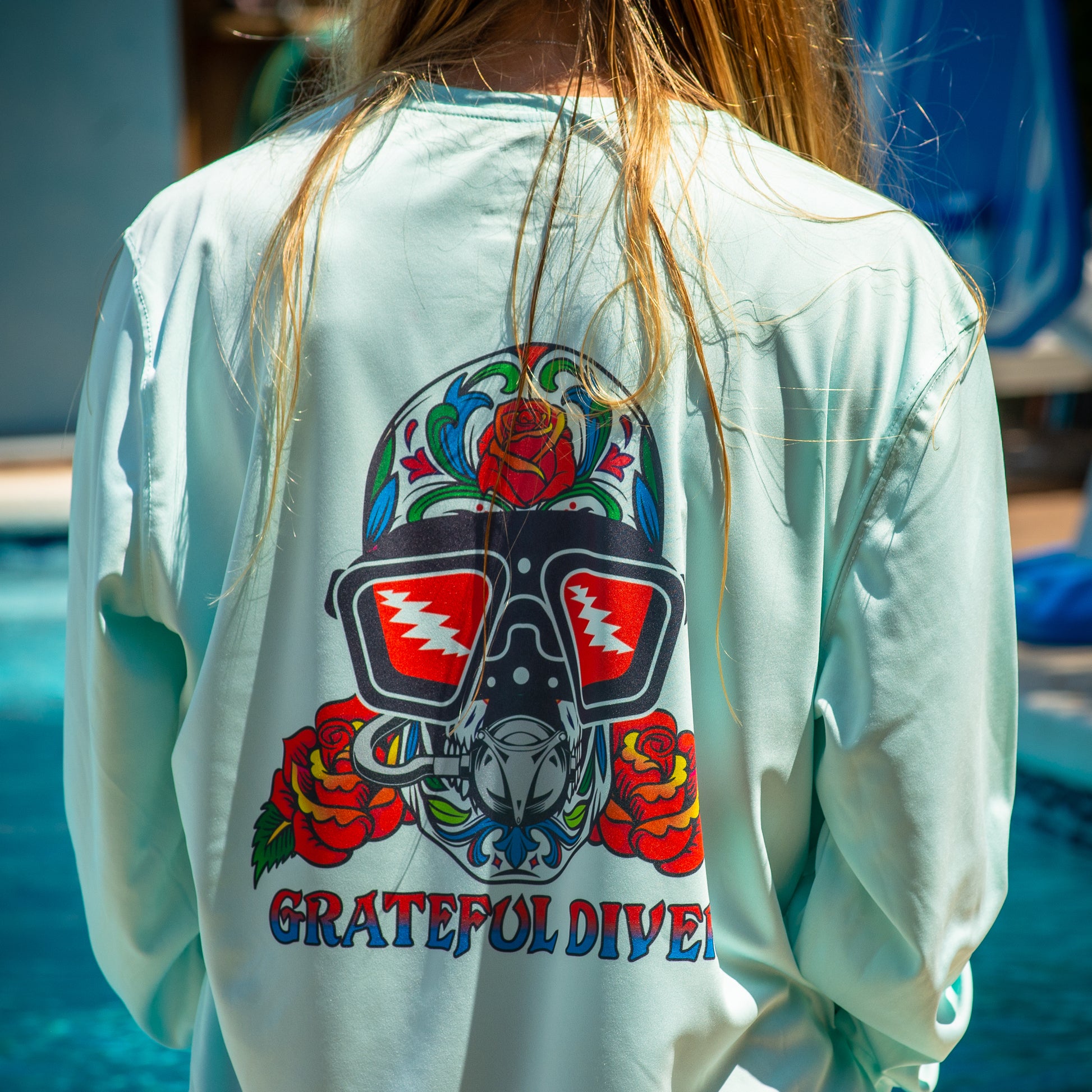 This killer design incorporates the original lightning bolt dive flag logo created in 1995 by Grateful Dead drummer, Bill Kreutzmann into the dive mask of the traditional Dia de Los Muertos sugar skull. Placed on a UV shirt, it's a bold and functional way to showcase your love for diving, the Grateful Dead, and marine conservation.