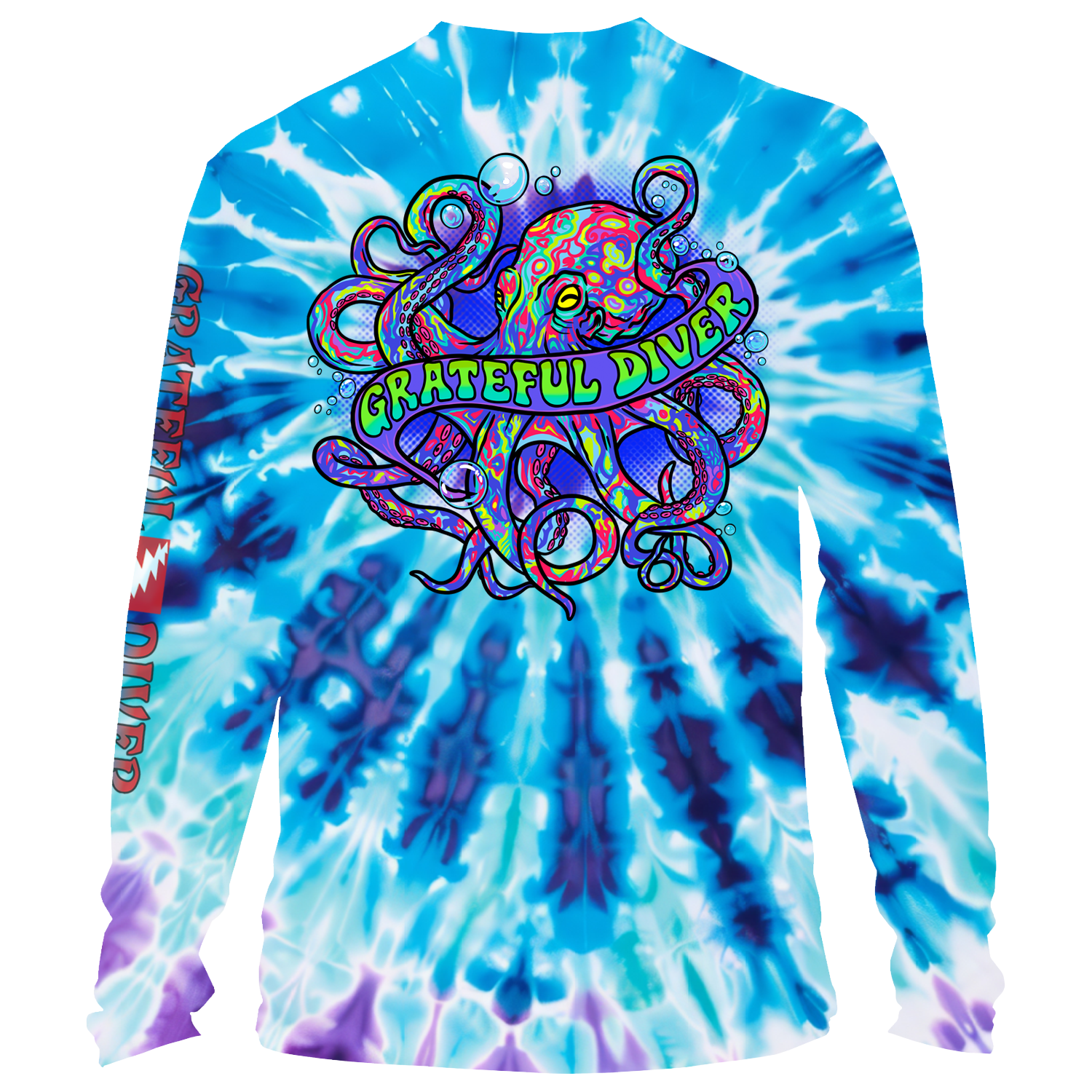 Embrace the vibrant, groovy colors of the underwater world with our Grateful Diver Octopus Tie Dye UV long-sleeve shirt, perfect for those who dive with style and spirit.