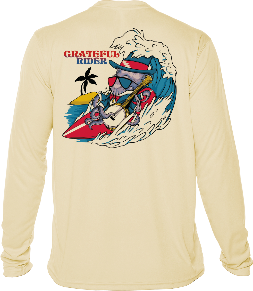 You can find Octopus Sam on the crest of a wave in the all new Surfing Sam UPF 50+ Performance Sun Shirt!